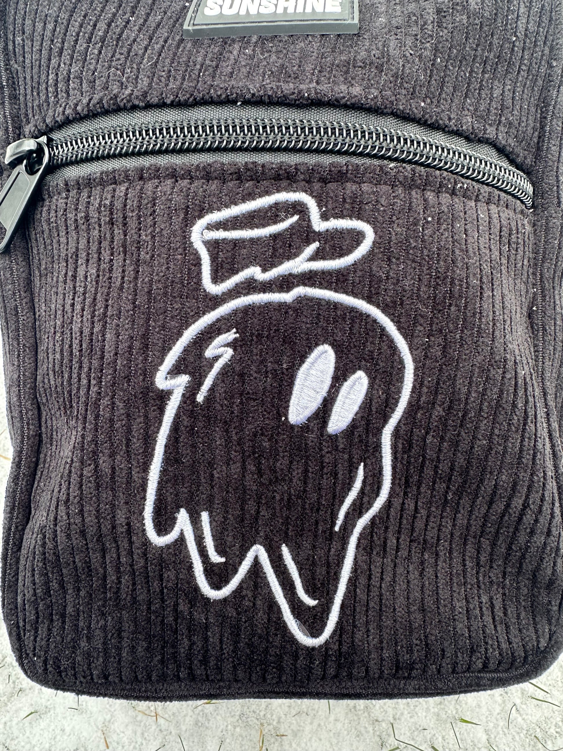 Details include an embroidered graphic, Sunshine rubber patch and a smooth black zipper closure.